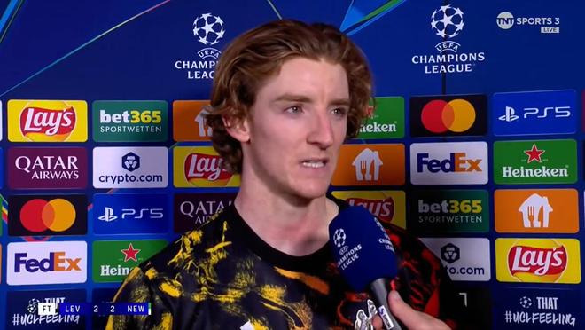纽卡斯尔联在欧冠联赛阶段第6轮客场2-2与勒沃库森打平。赛后,安东尼-戈登接受了TNT体育的采访。